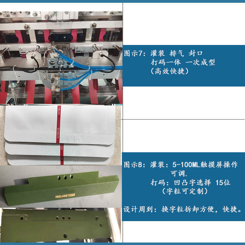 Automatic bag feeding, liquid filling, sealing, and finish bag out feeding; with auto counting function, no bag no fill, no bag no seal;
