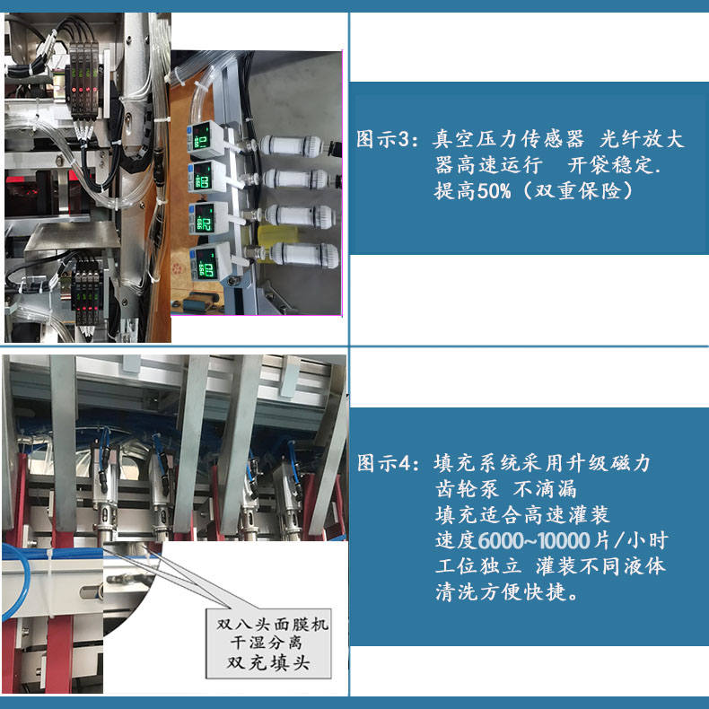 2.1、自動下袋、自動填充、自動封口、成品輸出、自動計數,無袋不充填,無袋不封口;