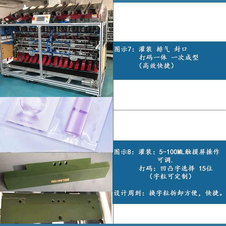 Automatic bag feeding, liquid filling, sealing, and finish bag out feeding; with auto counting function, no bag no fill, no bag no seal;