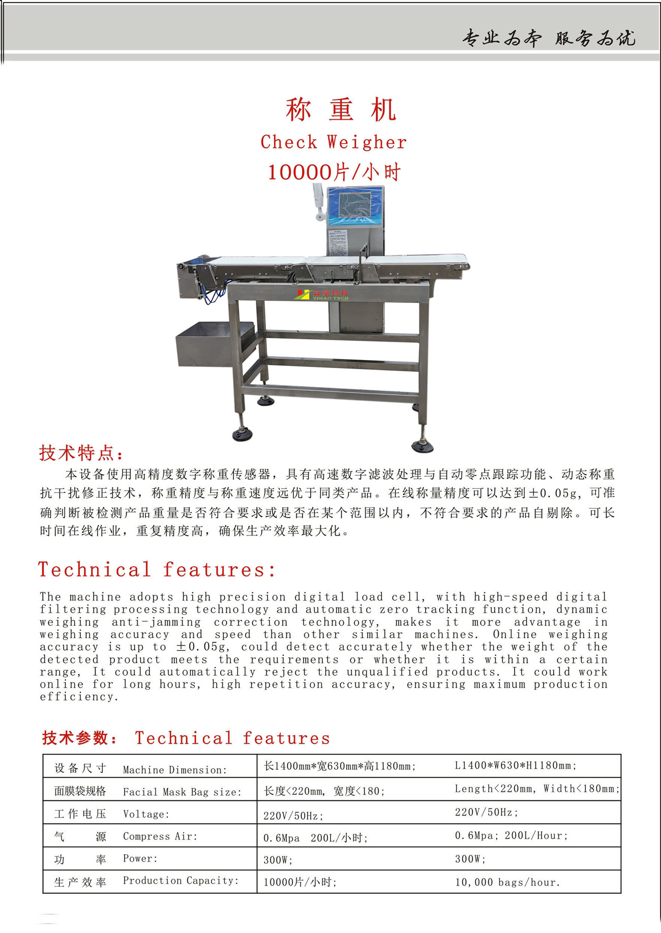 本設備分提速段、稱重段、傳送段(同時具有翻版剔除),使用高精度數字稱重傳感器,具有高速數字濾波處理與自動零點跟蹤功能、動態稱重抗干擾修正技術,穩重精主與稱重度遠優于同類產品,在線稱量重復精度可以達到±0.5g(速度越低精度越高),可準確判斷被檢測產品重量是否符合要求或是否在某個范圍以內,不符合要求的產品自動剔除,可長時間在線作業,重復精度高,確保生產效率最大化。