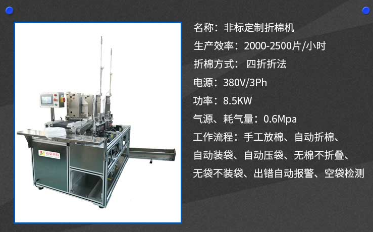 面膜折疊機產能每小時可以達到驚人的2000~2500片/小時,比傳統人工裝袋更快效率和質量更高,折疊機自帶不良品報警、剔除功能,帶有空袋檢測裝置,可保證成品中沒有空袋。折疊機采用PCL+液晶屏觸摸屏控制操作,可以輕松無壓力的設定參數,產量可控出錯提示更直觀。