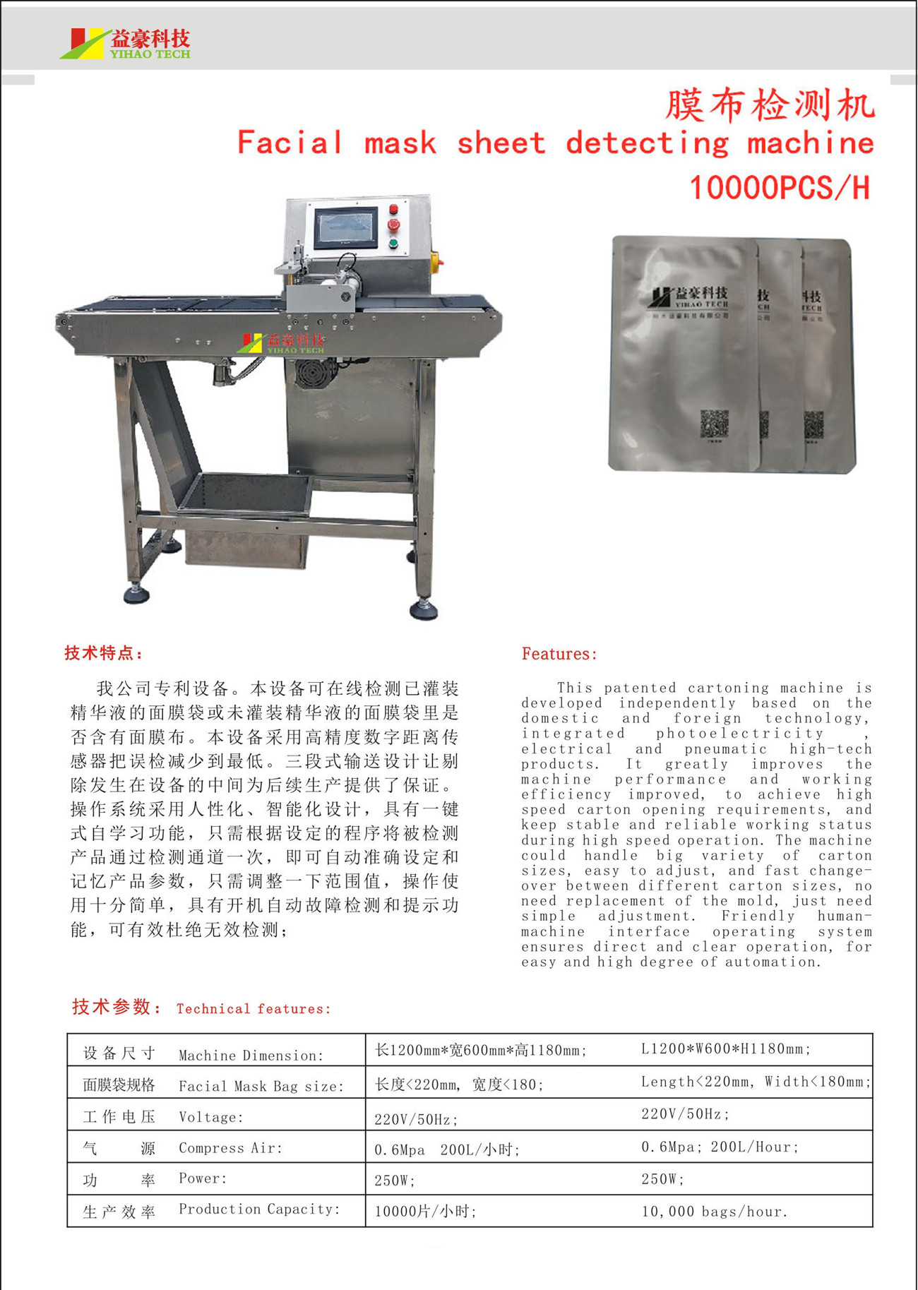 我公司專利設備。本設備可在線檢測已灌裝精華液的面膜袋或未灌裝精華液的面膜袋里是否含有面膜布。本設備采用高精度數字距離傳感器把誤檢減少到最低。三段式輸送設計讓剔除發生在設備的中間為后續生產提供了保證。操作系統采用人性化、智能化設計,具有一鍵式自學習功能,只需根據設定的程序將被檢測產品通過檢測通道一次,即可自動準確設定和記憶產品參數,只需調整一下范圍值,操作使用十分簡單,具有開機自動故障檢測和提示功能,可有效杜絕無效檢測